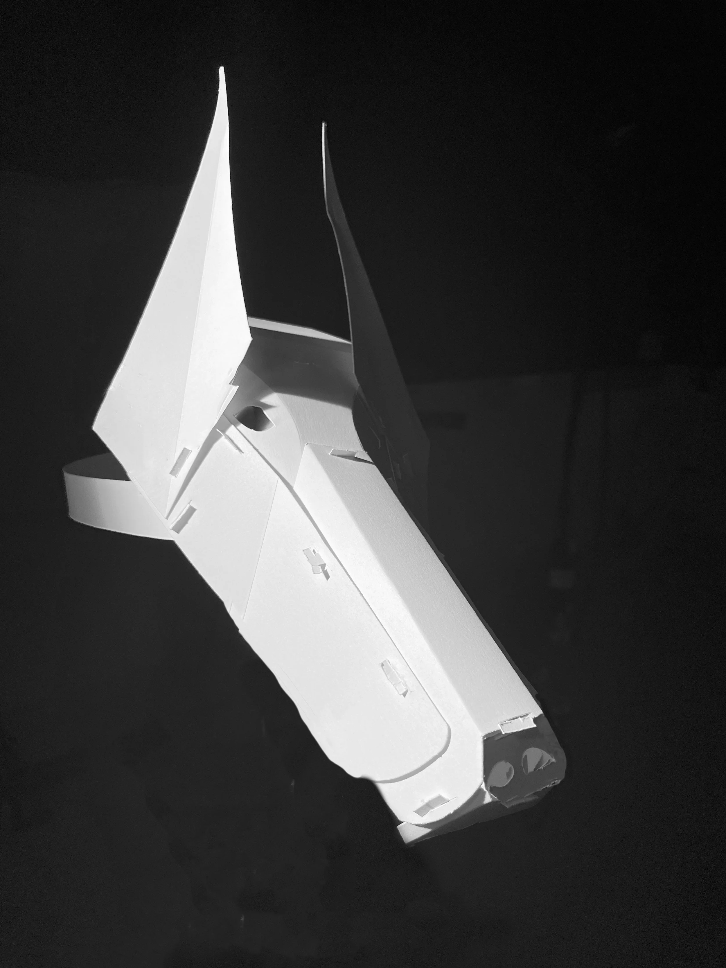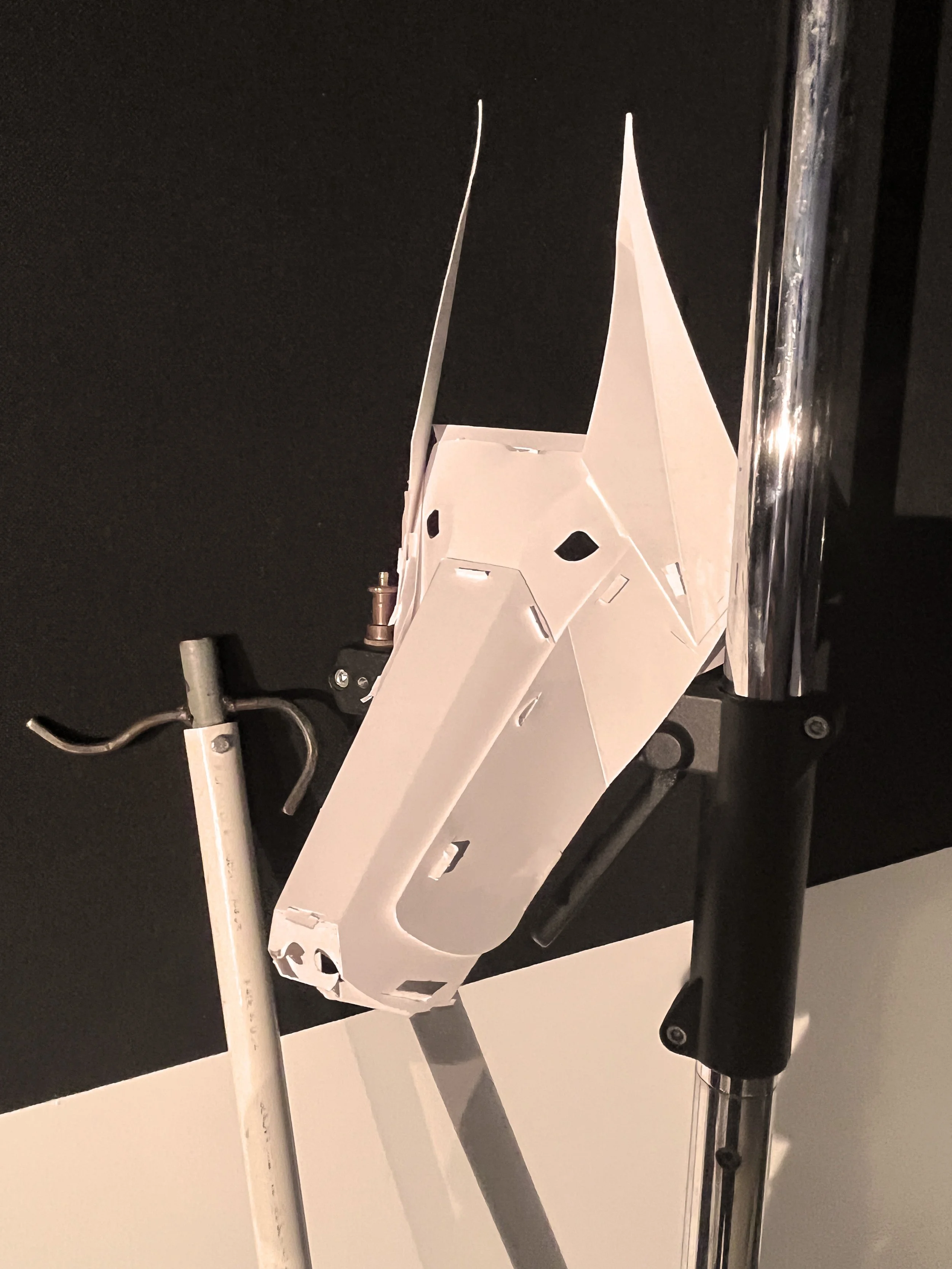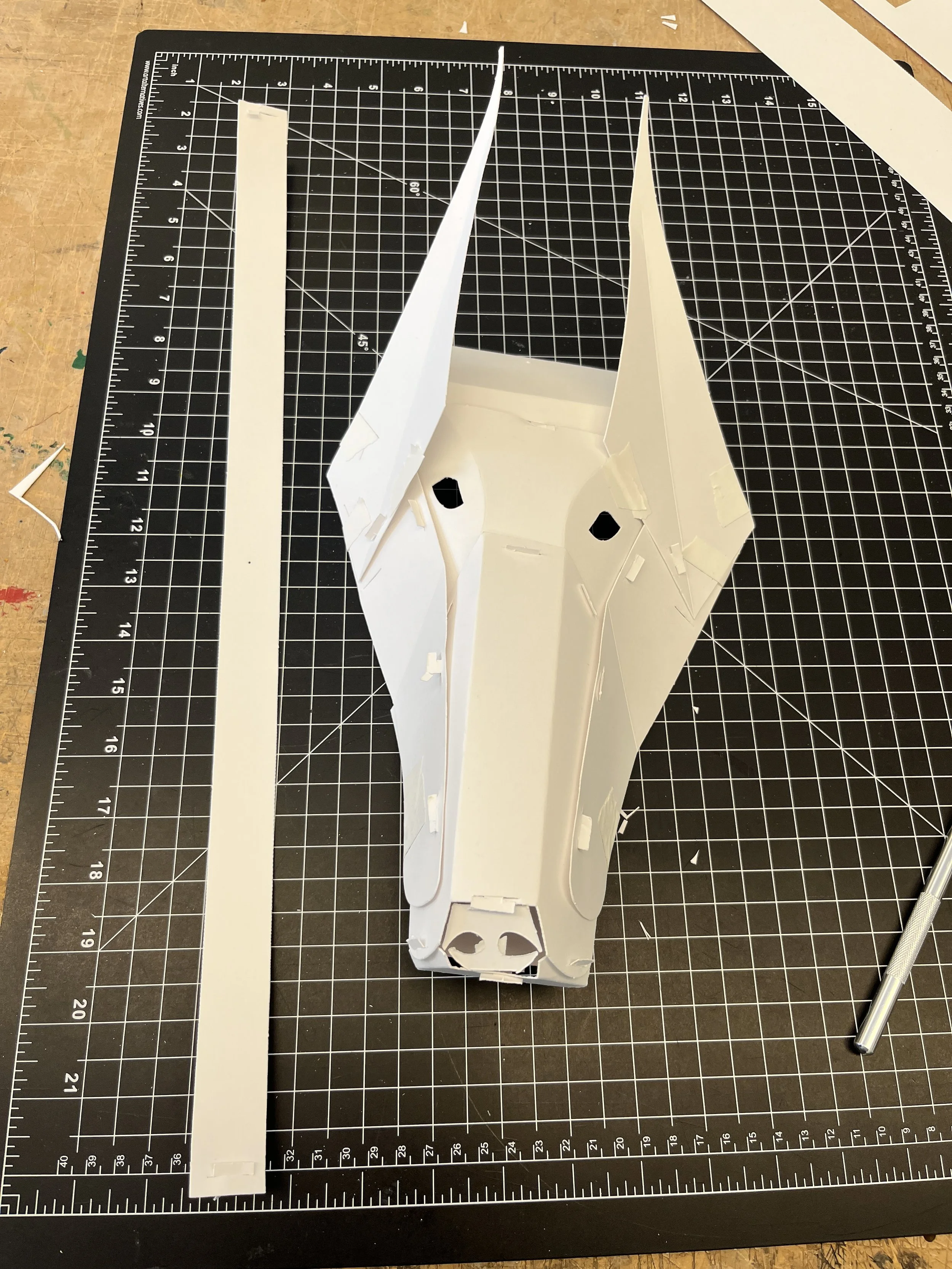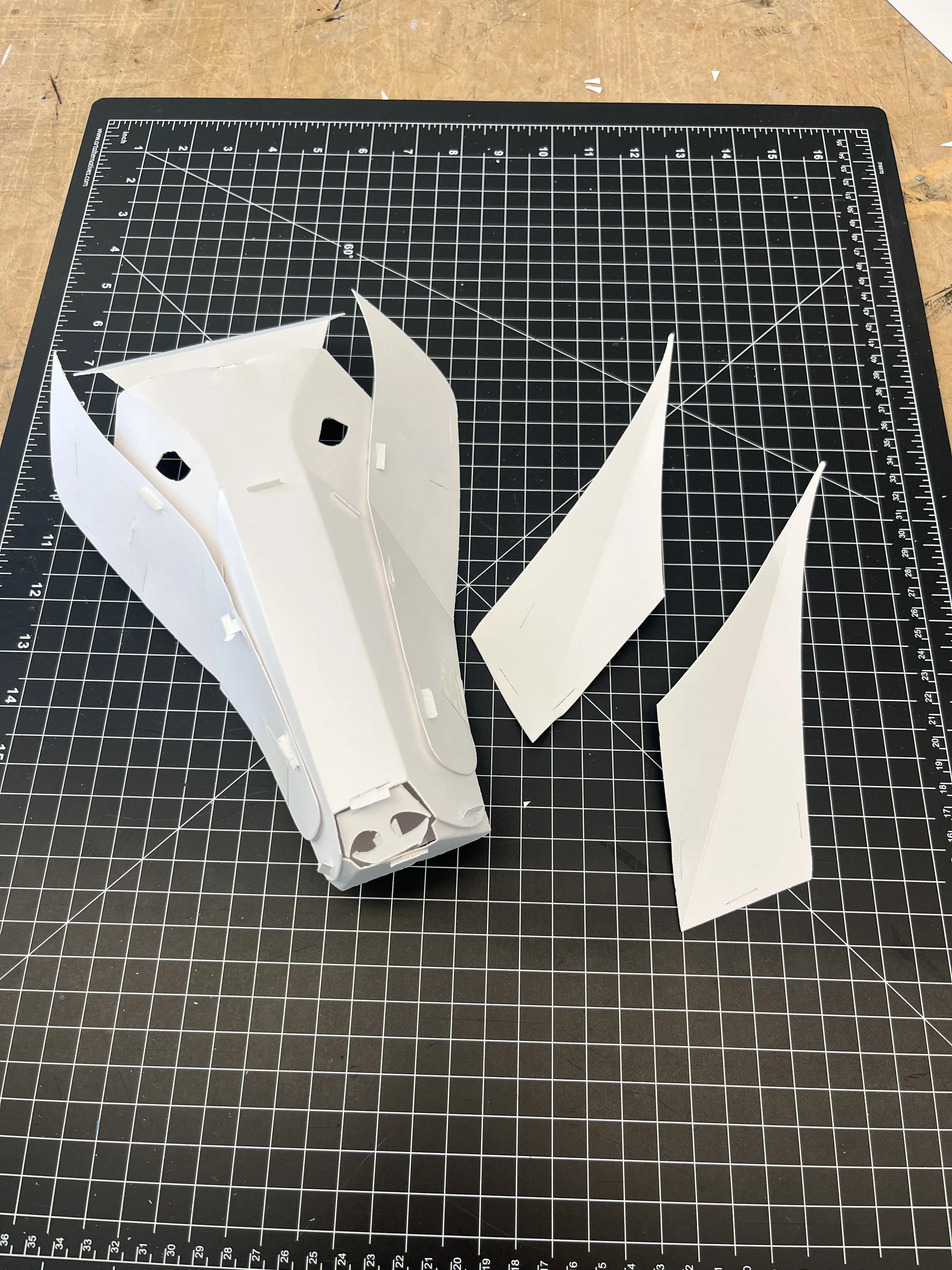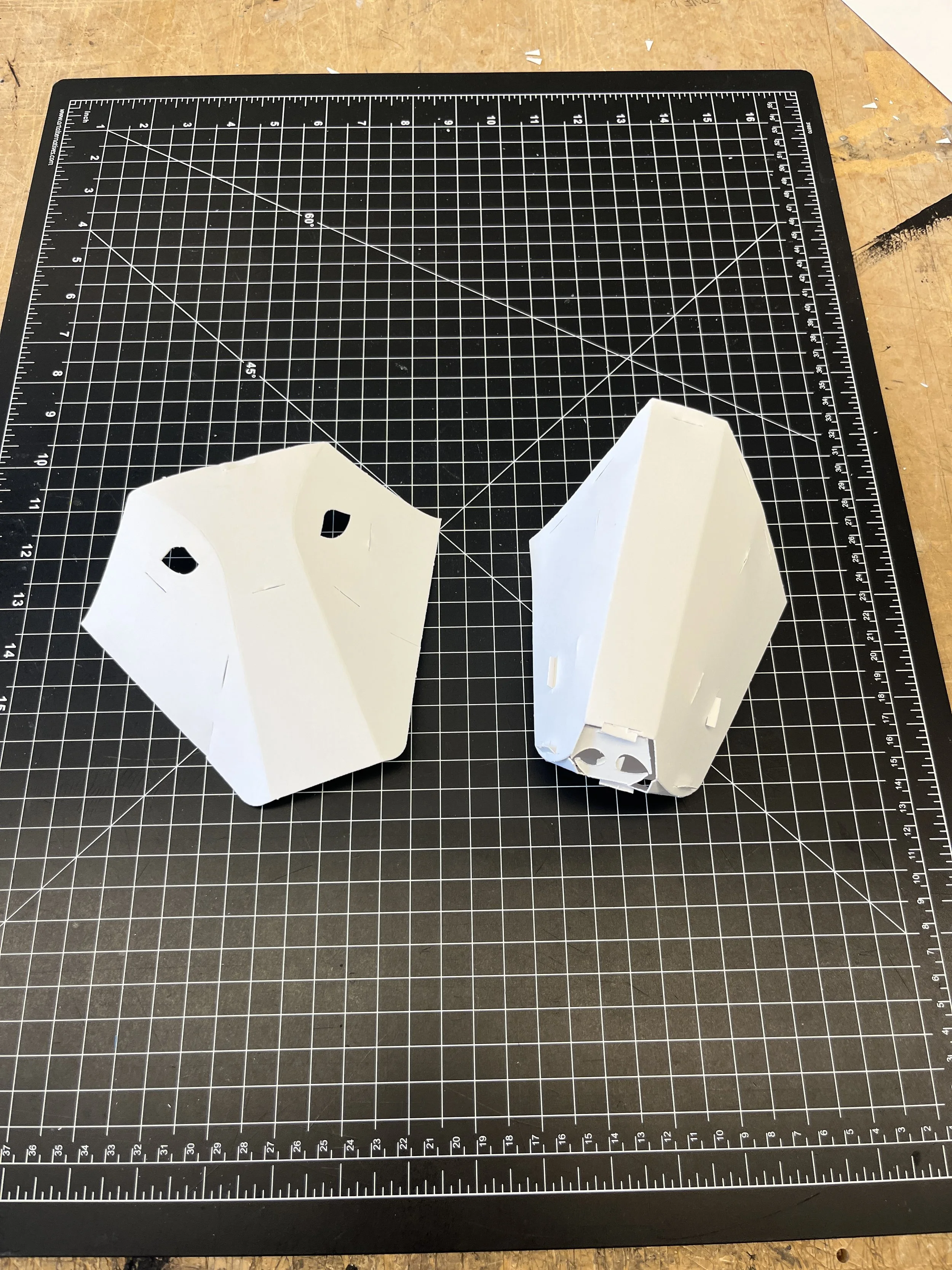 Eventually, after many taped mockup masks and early development tabbed masks, a balance was found that incorporated all the successful details of each iteration into one, completely tabbed mask.