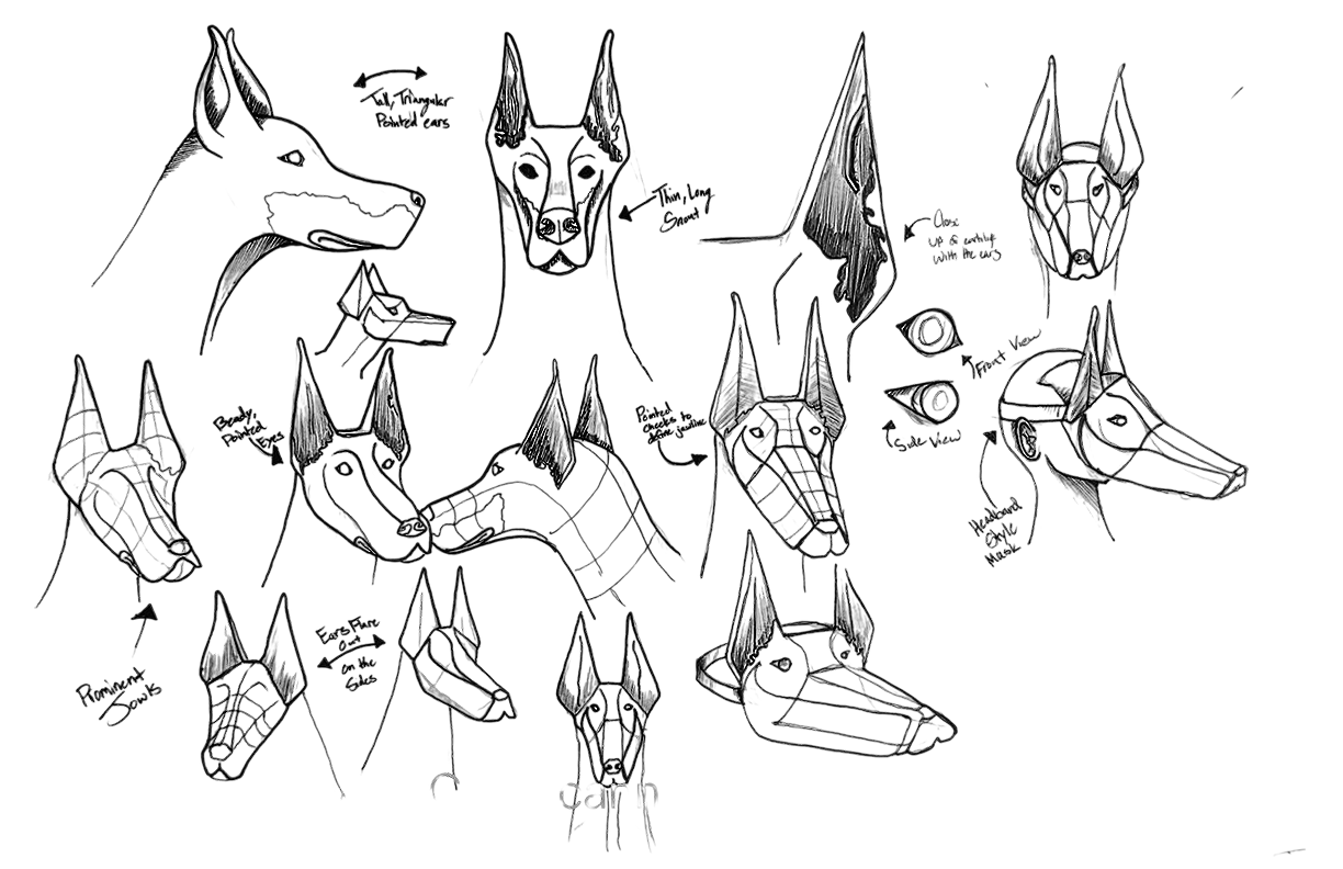 To design a mask capturing the essence of a Doberman, I first identified its key traits. Mainly the tall pointy ears, a long slim snout, and angled beady eyes were portrayed through sketches and thumbnails.